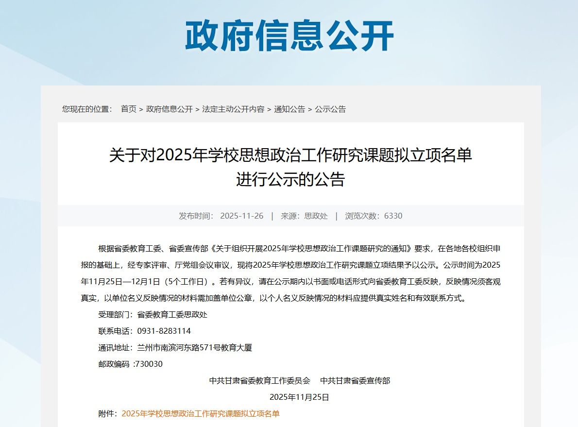 近日,中共甘肃省委教育工作委员会、中共甘肃省委宣传部2025年学校思想政治工作研究课题拟立项名单公布,兰州信息科技学院教师杨燕获批重点课题一项。