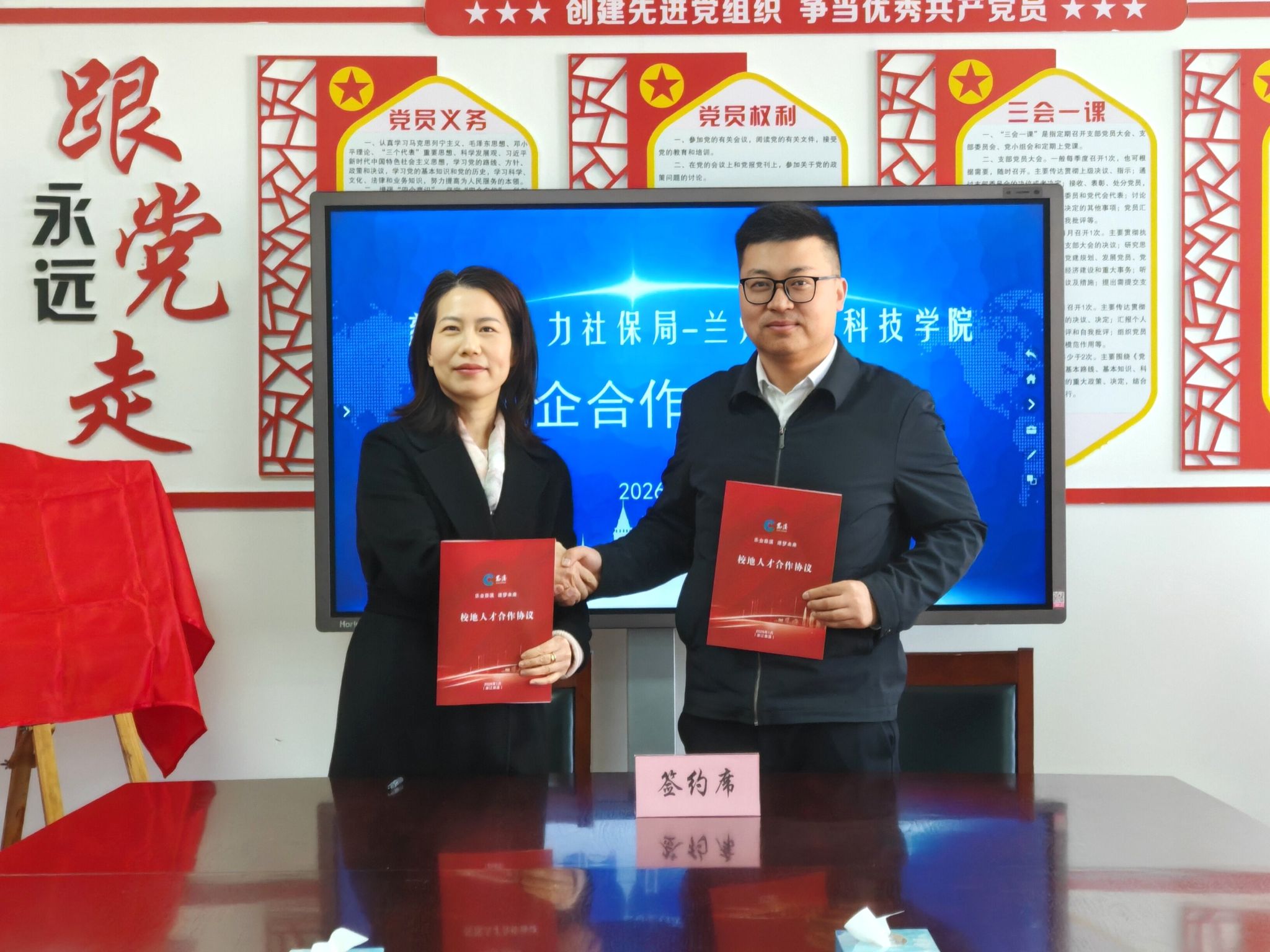 兰州信息科技学院与慈溪市人力资源和社会保障局举行合作签约暨基地互授仪式。慈溪市人社局主要领导及相关科室负责人、学校相关部门代表出席活动。苏存兴副校长与慈溪市人力社保局副局长孙双亚共同签署校地合作协议,并互授“就业实习基地”与“浙江慈溪后备人才基地”牌匾,旨在通过资源整合,构建常态化、高效率的人才交流与培养平台,推动人才供需精准对接,既为学生拓展优质实习就业渠道,也为慈溪产业高质量发展注入持续的人才动能。